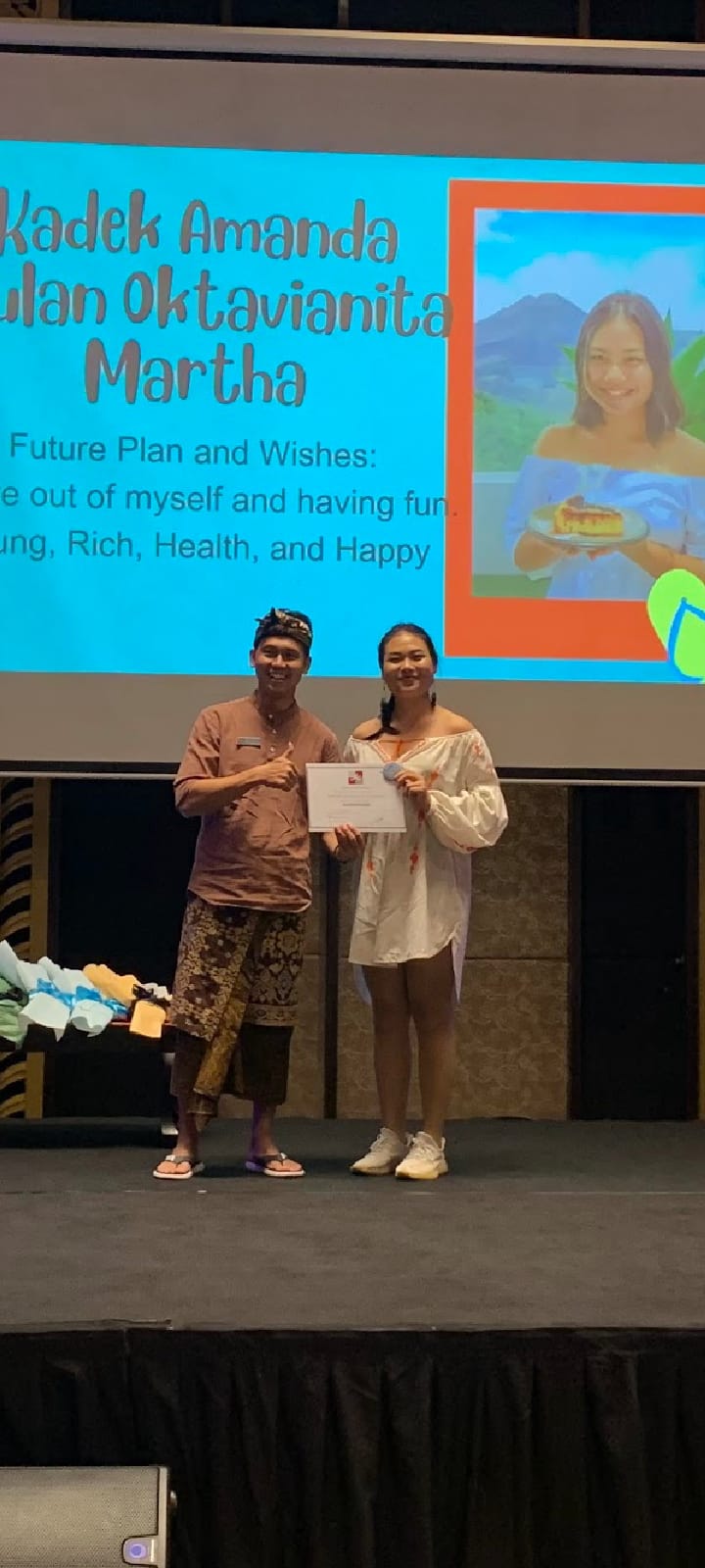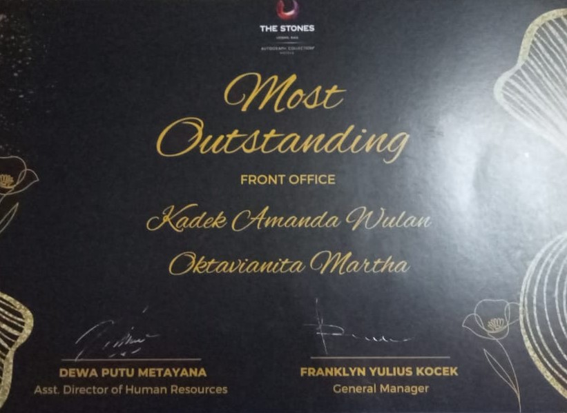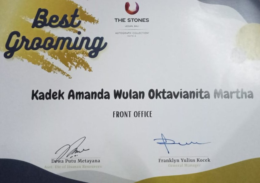 Siswa berprestasi ini adalah Kadek Amanda Wulan Oktavianita Martha, siswi kelas XII AP 1 SMK Pariwisata Harapan. Prestasi yang telah ditorehkannya adalah Most Outstanding dan Best Grooming yang diadakan oleh “THE STONES” salah satu hotel bintang lima diBali. Perlu diketahui, siswi ini mengalahkan perguruan tinggi yang juga sedang melakukan praktek kerja lapangan atau training pada event hotel ditersebut. Event ini dilakukan untuk memberi penghargaan kepada staff pada hotel tersebut karena sudah mampu mentreatment tamu dengan baik dan juga meningkatkan kinerja dan semangat kerja. Maka dari itu yuk buruan daftar di SMK Pariwisata Harapan yang sudah berMOU dengan sebagian hotel bintang lima yang ada di Nusa Dua dan Kuta.